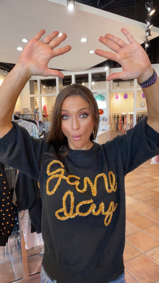 BLACK AND GOLD GAME DAY METALLIC LETTER SHORT PUFF SLEEVE SWEATER