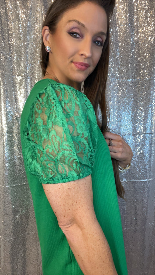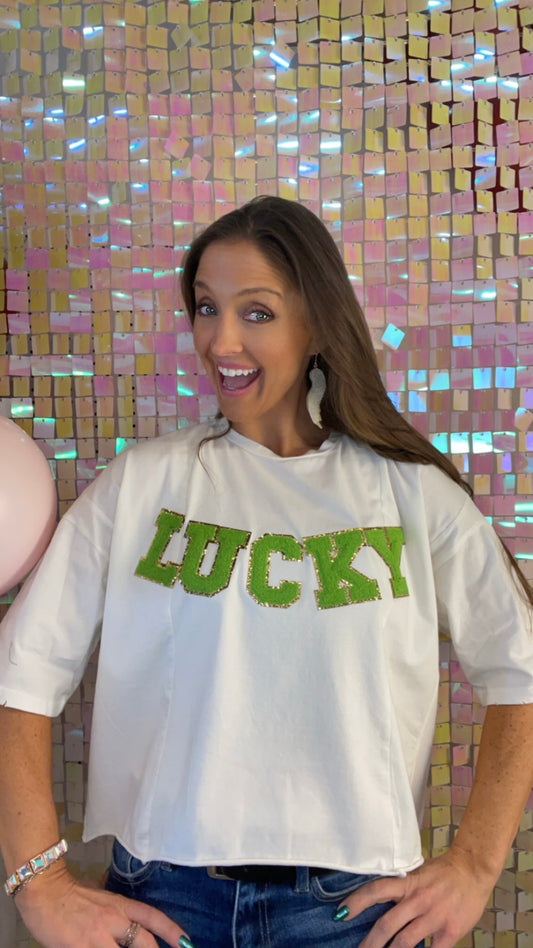 LUCKY Gold Glitter with Green Chenille Letters Mom Crop